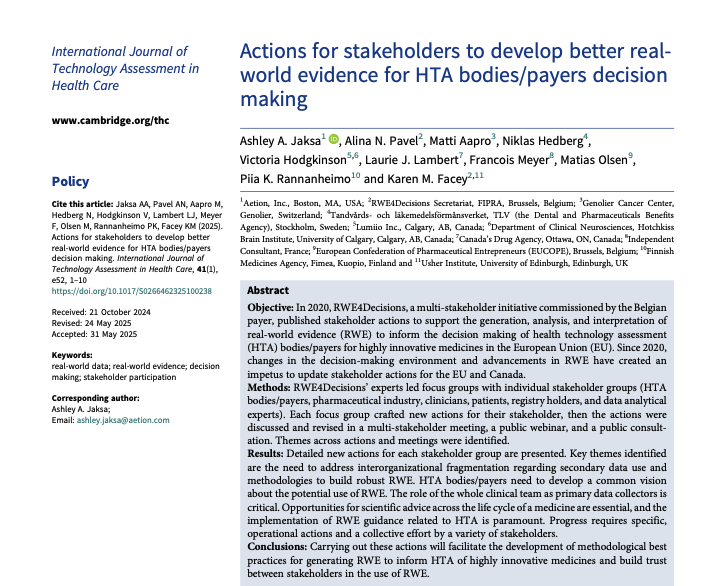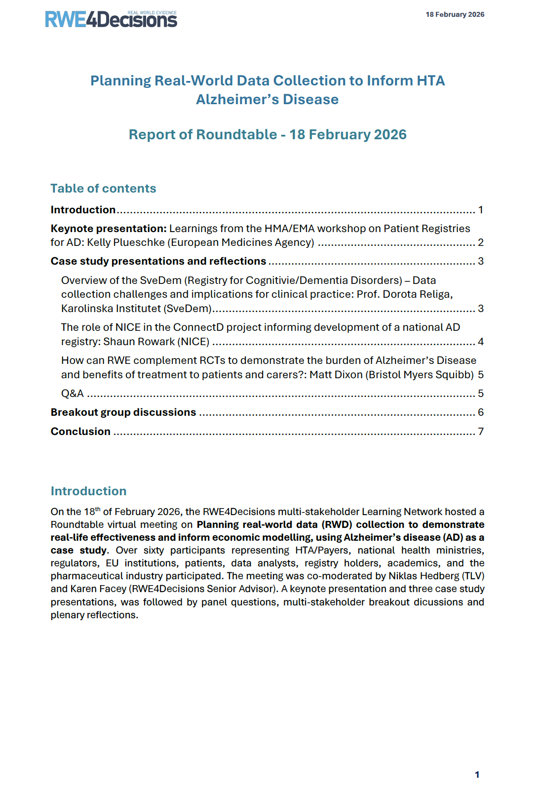 RWE4Decisions is a multi-stakeholder Learning Network on how fit-for-purpose RWE over the life cycle of highly innovative medicines can inform HTA/Payer decisions.